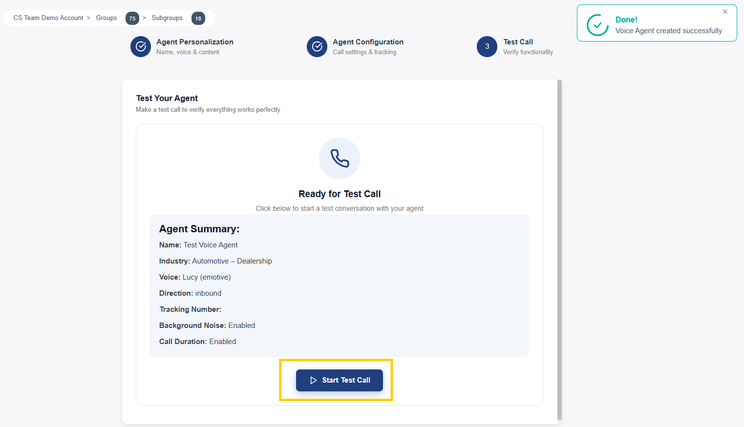 - Click Start Test Call & Create Agent to: