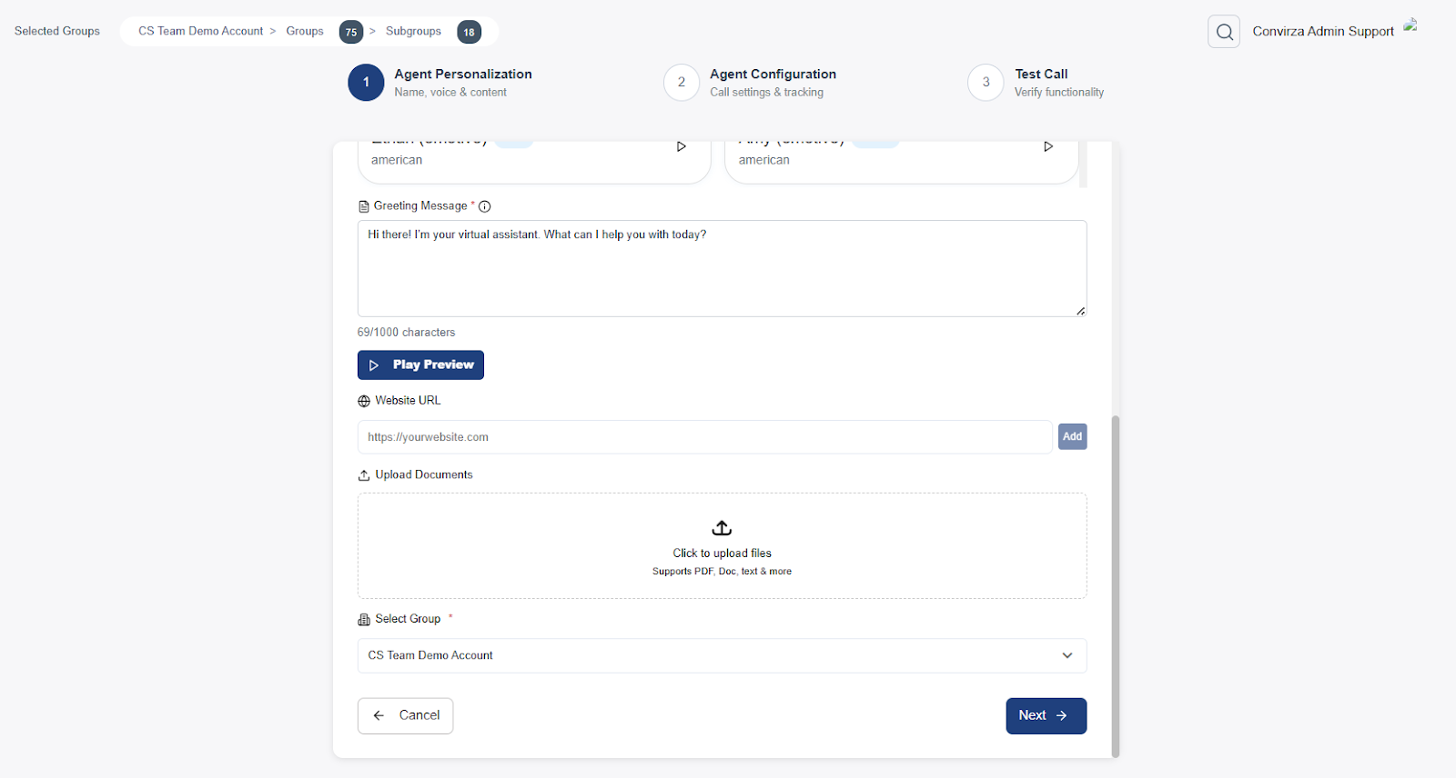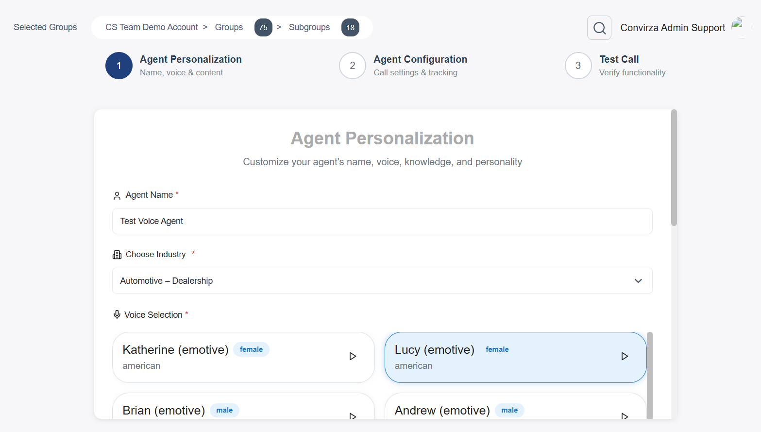 On the Agent Personalisation screen, configure the basic identity of your AI Voice Agent: