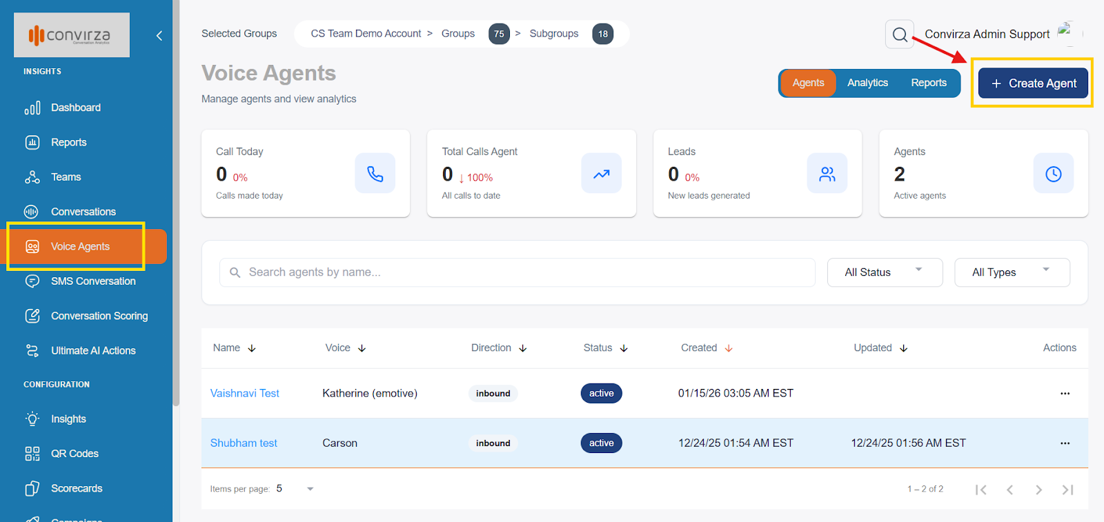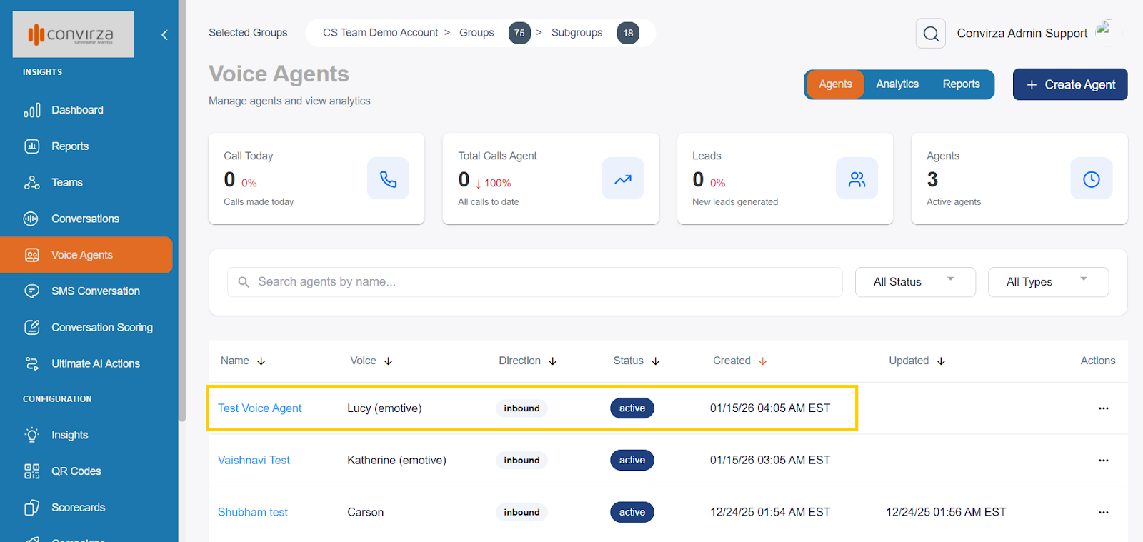 - Once created, the agent will appear on the Voice Agents dashboard.