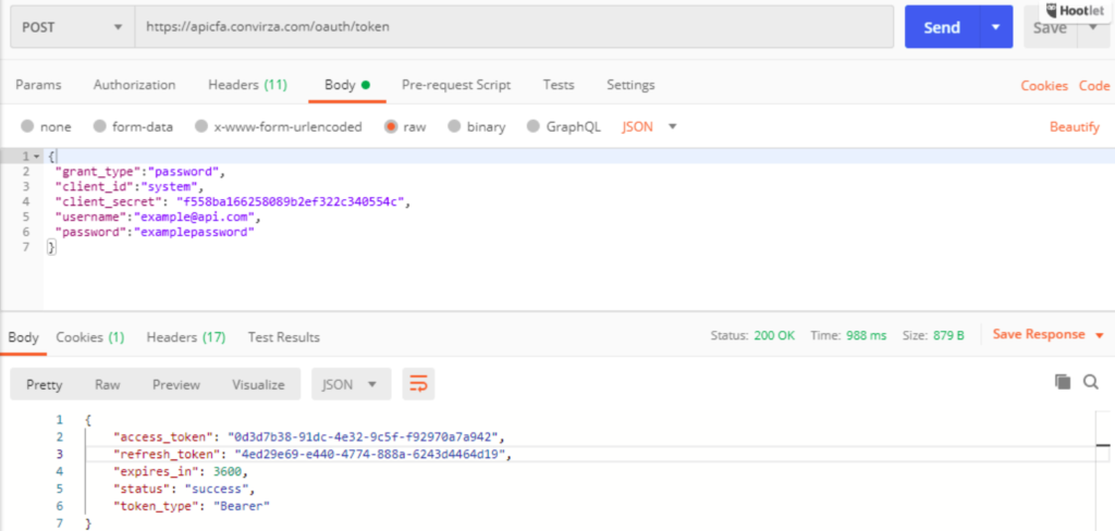 Sample: POST Request body (JSON) and Response output (JSON) for authenticating and retrieving the access token: