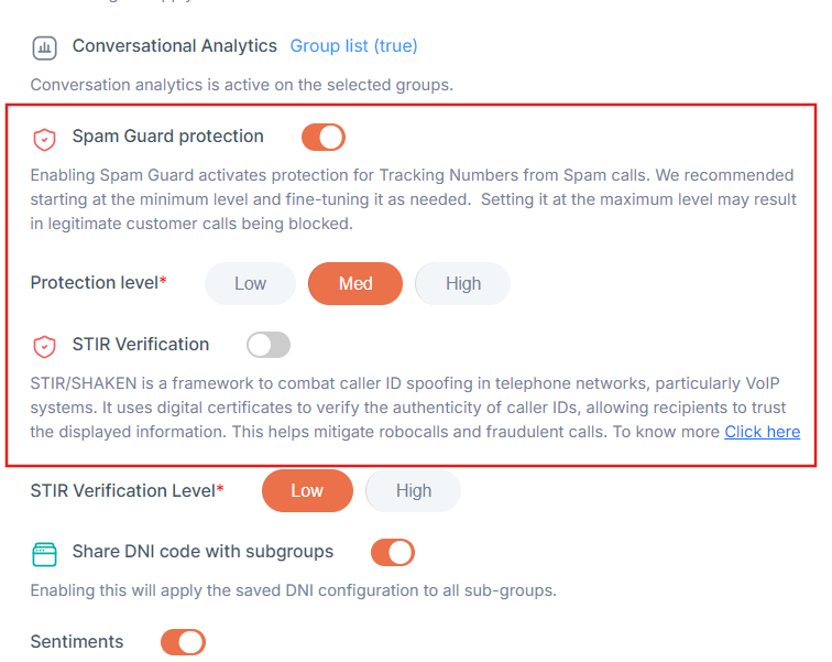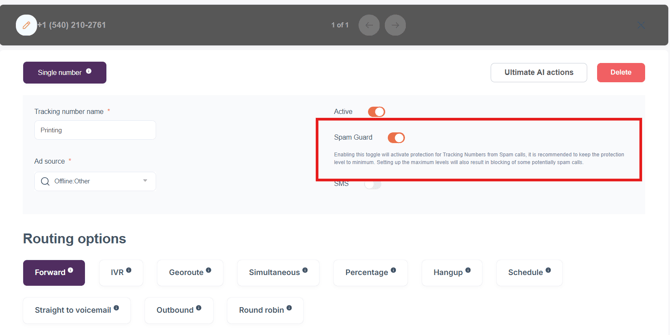 - For new tracking numbers, if Spam Guard is already enabled at the group level, it will be ON by default.