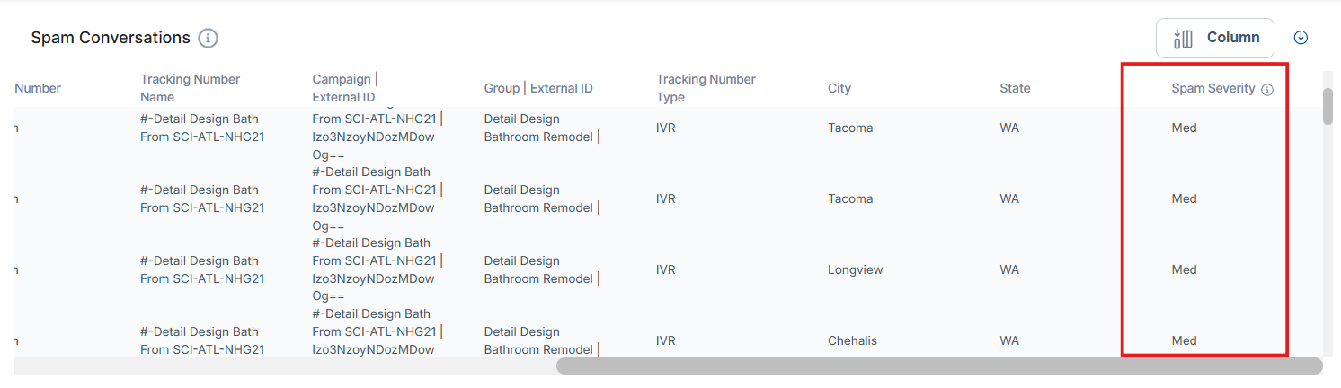 - Spam Severity: Represents the spam likelihood score — a higher severity means a higher chance the call originated from a spam source.