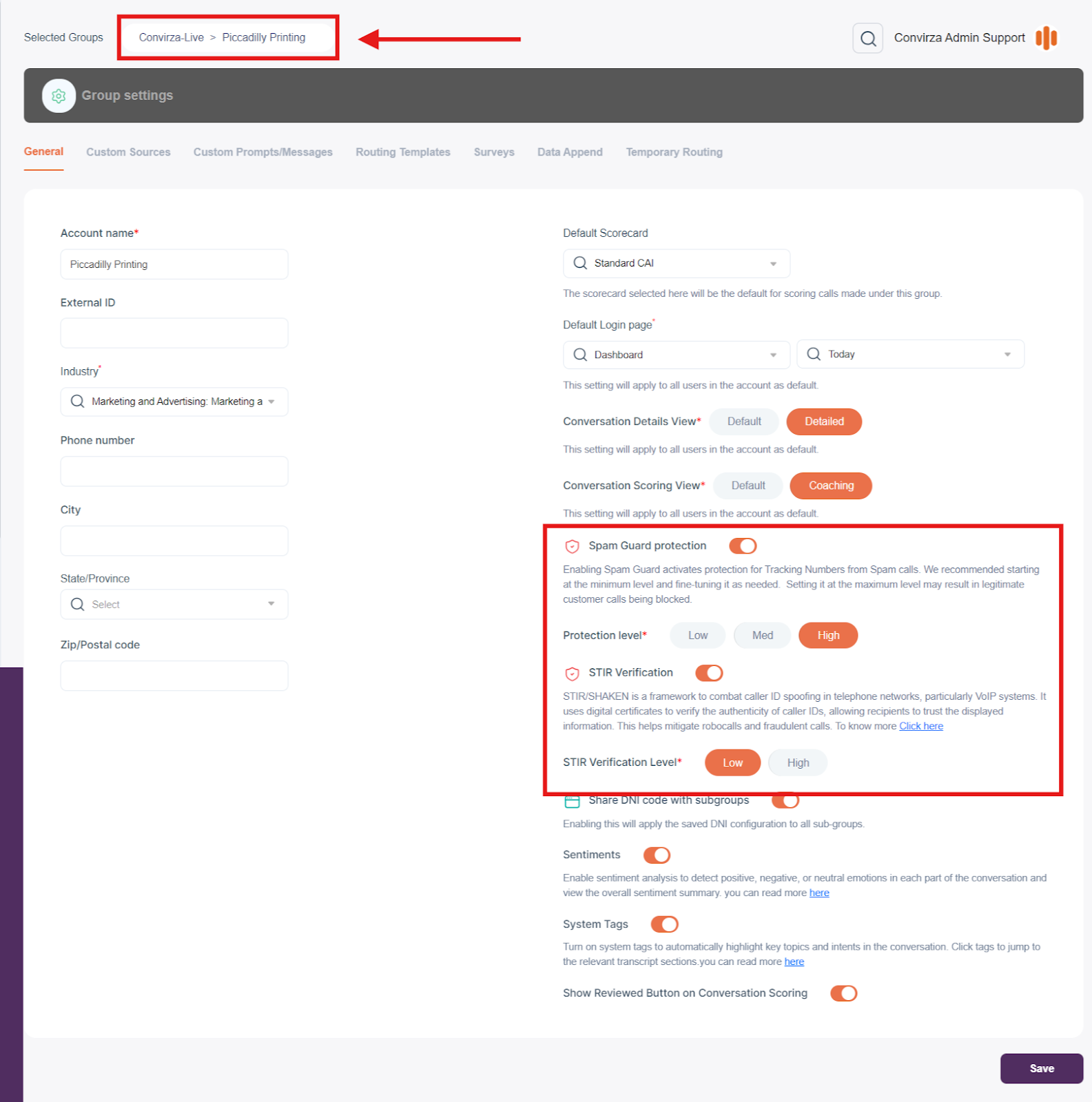 - Make sure Spam Guard Protection is toggled ON at both the Group and Tracking Number levels.